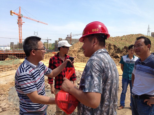 7月30日上午,總公司常務(wù)副總王淳、安質(zhì)部部長(zhǎng)沈達(dá)及工程部同事親赴高速·銅都天地工地現(xiàn)場(chǎng)視察工作,并帶來(lái)礦泉水和防暑降溫的藥品給工地。公司總經(jīng)理周建波,副總經(jīng)理王幼之、侯德應(yīng)、劉義傲等陪同。常務(wù)副總王淳叮囑現(xiàn)場(chǎng)項(xiàng)目負(fù)責(zé)人,調(diào)整工人的作業(yè)時(shí)間,合理安排作息時(shí)間,嚴(yán)格實(shí)行“抓兩頭、歇中間”的避高溫措施,進(jìn)一步加強(qiáng)監(jiān)督管理。